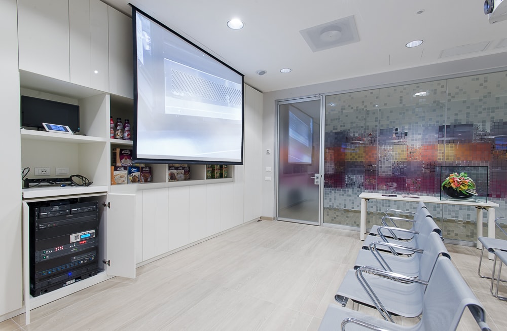 Durante tutto l’allestimento sono state eseguite realizzazioni custom per l’integrazione con gli arredi e le strutture presenti, in stretta collaborazione con lo studio di architettura responsabile del progetto della sede.